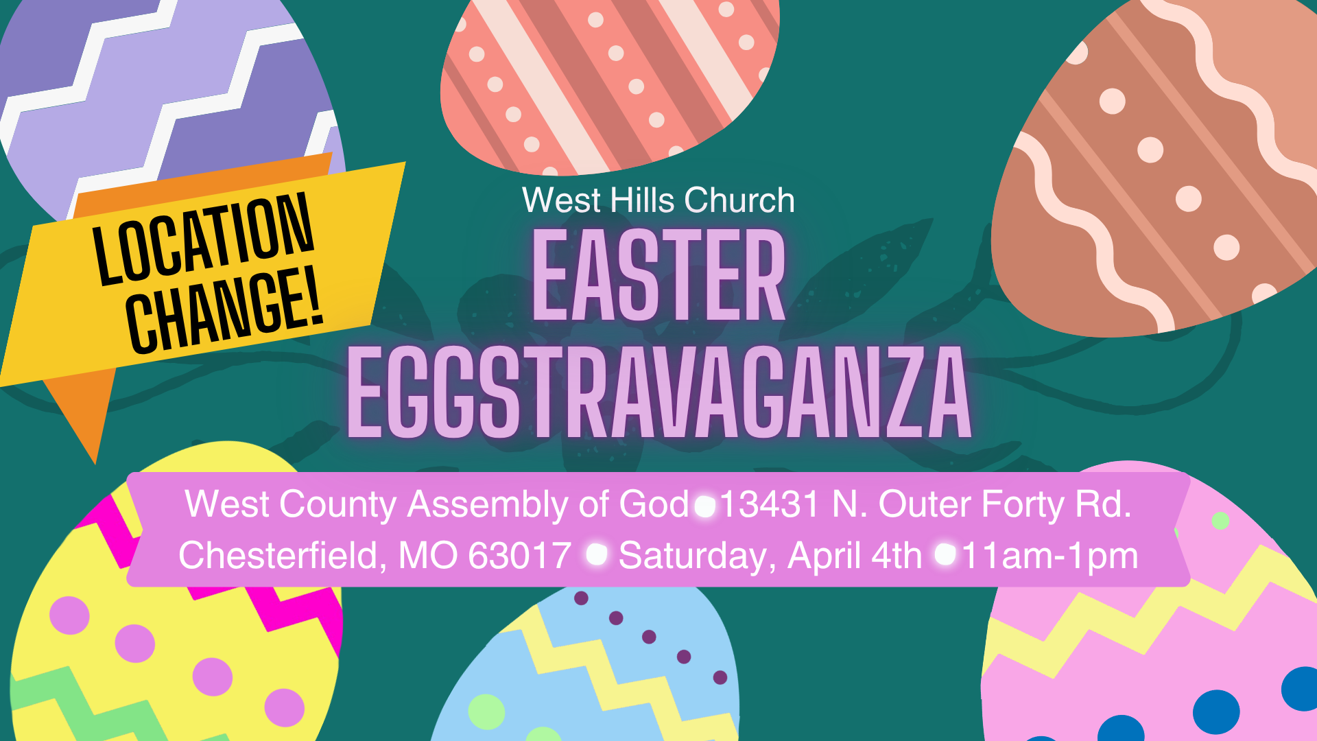 You're invited to our annual West Hills Easter Eggstravaganza! This year it will be hosted at West County Assembly of God (13431 N Outer 40 Rd, Chesterfield, MO 63017) from 11am-1pm.