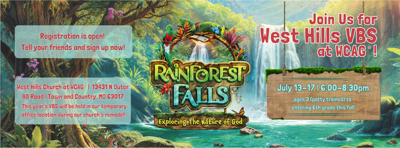 Get ready for a week-long adventure at West Hills! At Rainforest Falls VBS, kids (ages 3 & potty trained through entering 6th) will embark on a wild, creature-filled adventure where they will learn that God is Creator, All-knowing, our Refuge, Love, and Forever.